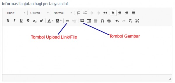 Untuk mengunggah file pendukung (gambar/pdf dsb), pengguna dapat menekan tombol link maupun tombol gambar pada editor teks seperti diperlihatkan pada gambar berikut ini :